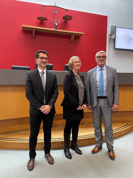 Photo : Monsieur le Bâtonnier Jean-Noël CHEVASSUS (droite) avec Madame Hélène BLONDEAU-PATISSIER (centre), installée en qualité de Présidente de juridiction ; et Monsieur Benoît BACHELET (gauche), Procureur de la République.